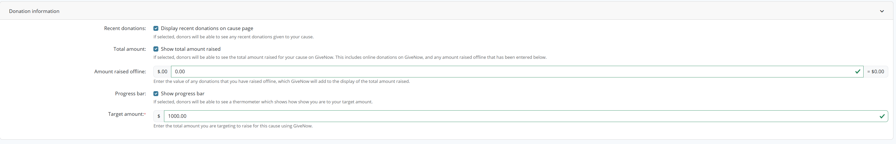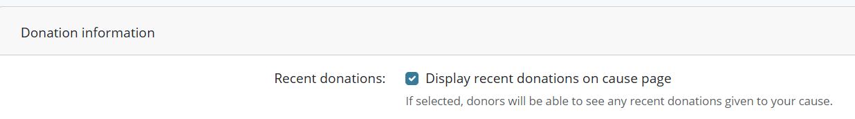 3. As soon as you have a few donations come in, tick “Display recent donations on cause page.” to create social proof for potential donors.