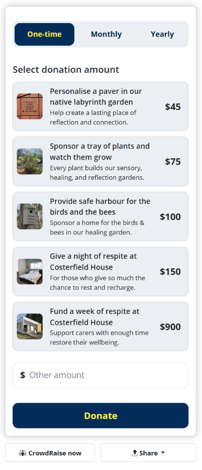 If you are combining one-off and regular donations in one cause, we suggest using One-off/Monthly/Yearly or One-off/Weekly/Monthly.